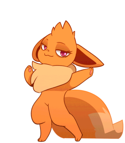 Animated sticker of Eevee from Pokémon, dancing with a smug expression and a cute smile.