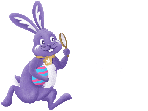A cheerful purple Milka Easter bunny, holding a magnifying glass and a striped egg, ready for an exciting egg hunt.
