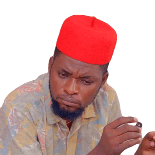 Mazi Nduka, wearing a red cap, looks doubtful and suspicious, reacting with "Ehh?".