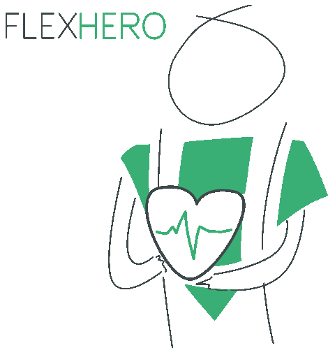 A stick figure with 'FLEXHERO' text holds a heart with a pulse, symbolizing volunteer work and health.