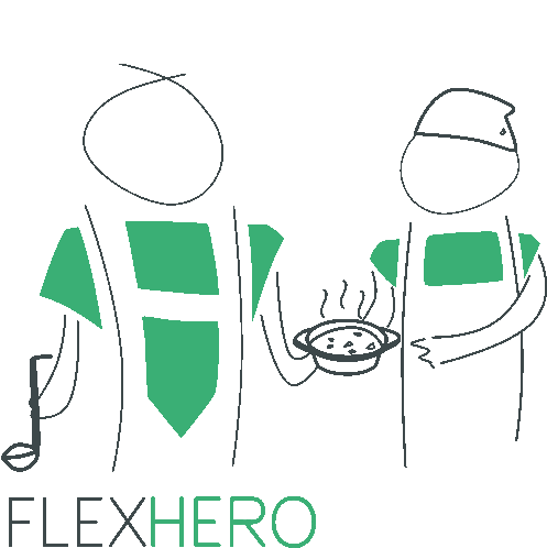 Two stick figures, one with a ladle and the other with a steaming bowl, represent volunteering and helping through cooking, featuring the Flexhero logo.