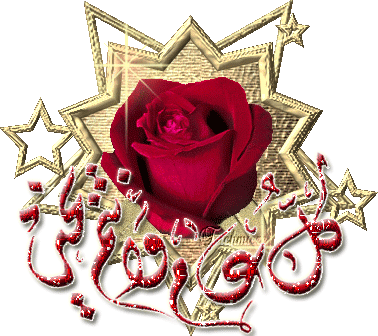 A glittering red rose surrounded by golden stars and Arabic calligraphy for Eid Mubarak.