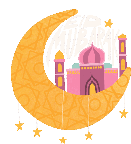 A vibrant Eid Mubarak greeting featuring a pink mosque, golden crescent moon, and twinkling stars, celebrating the festive occasion.