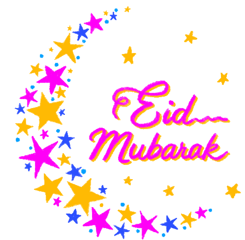 Vibrant animated sticker featuring 'Eid Mubarak' text, a crescent moon made of stars, and a mosque silhouette.