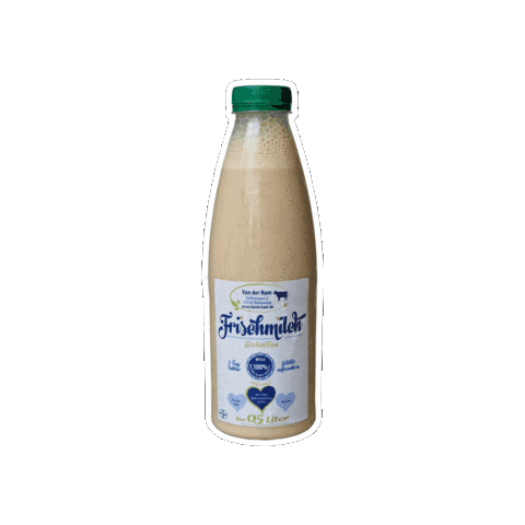 A bottle of Van der Ham Frischmilch Eiskaffee (fresh milk iced coffee) with a green cap, featuring a farm label.