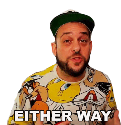 A man, Doodybeard, wearing a Looney Tunes shirt and a hat, says 'Either Way' with a shrug.