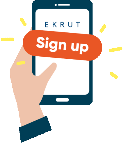 An animated sticker showing hands tapping a 'Sign up' button on a smartphone for the EKRUT app, indicating registration.