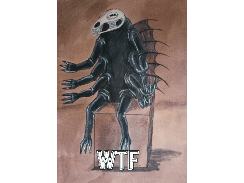 A detailed drawing of a grotesque monster with a skull head, multiple limbs, and sharp claws, sitting on a box, with 'WTF' text.