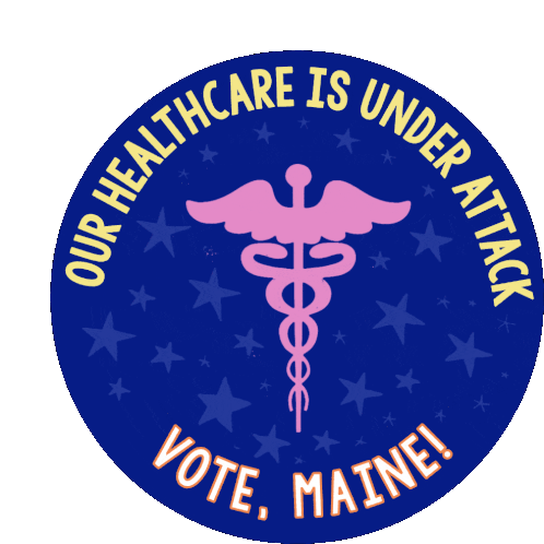 A circular sticker urging people to vote in Maine, emphasizing that healthcare is under attack, featuring a caduceus symbol.