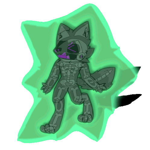 Animated sticker of a skeleton Xeno or Protogen character getting an electric shock, showing its bones and purple eyes.