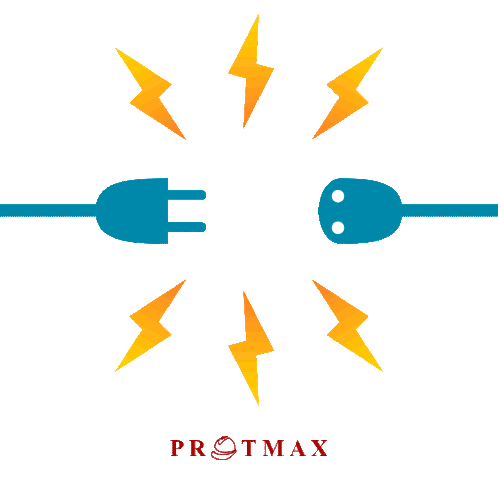 Animated sticker showing a blue electrical plug and socket connecting, surrounded by yellow lightning bolts, with 'PROTMAX' text.