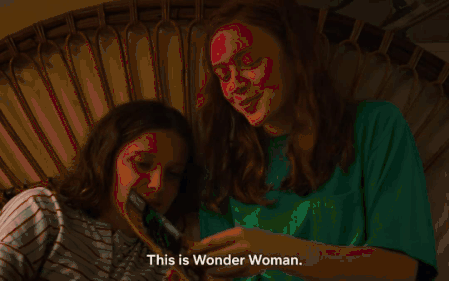 Eleven and Max from Stranger Things share a moment, discovering Wonder Woman, followed by a glimpse of iconic boots.