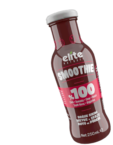 An animated sticker of an Elite Naturel 100% cold-pressed fruit and vegetable smoothie bottle, featuring a vibrant red label.