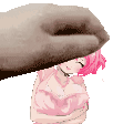 A hand gently holds Elle, the pink-haired character from the game Crush Crush, in a cute and playful pose.