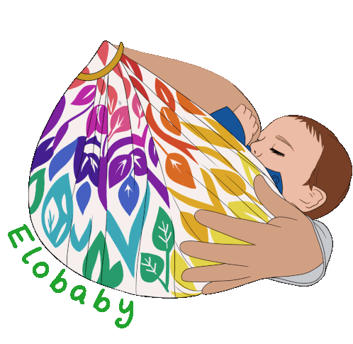 Elobaby sticker featuring a sleeping baby in a colorful, leaf-patterned ring sling, held gently by an adult's arm.