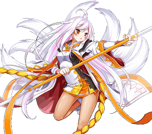 Animated sticker of Elsword character Ara Haan, a nine-tailed fox spirit, holding a spear with changing hair color.