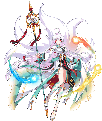 Animated sticker of Elsword's Ara Haan, a fox spirit character, with changing hair colors, holding a staff. Also features Arataki Itto.
