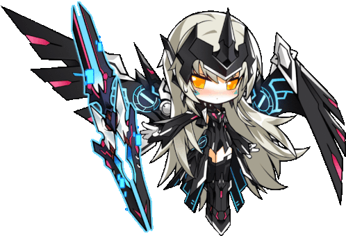 Elsword Eve, the Code Empress, in a chibi style, featuring her futuristic armor, large wings, and glowing weapon.