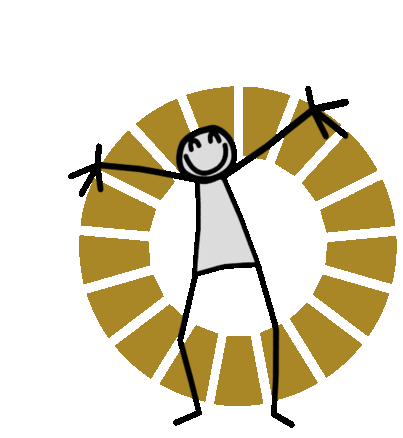 Elyx Elyxyak, a happy stick figure, stands with arms outstretched inside a golden segmented ring, smiling.