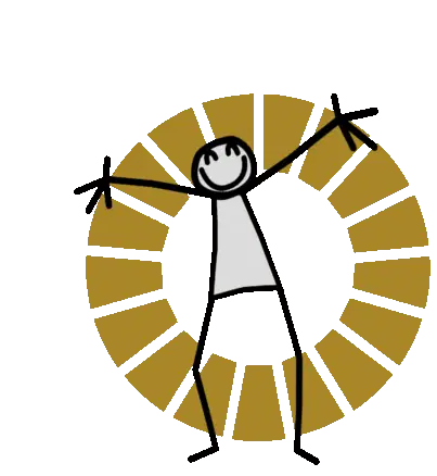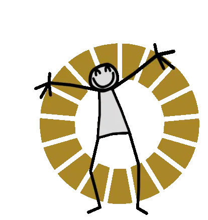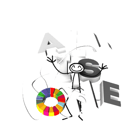 Elyx Elyxyak stick figure character interacting with abstract letters and a colorful global goals ring.