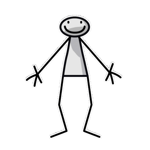 Elyx, the stick figure character, performs a happy dance with peace signs before transforming into a unique, long-legged form.