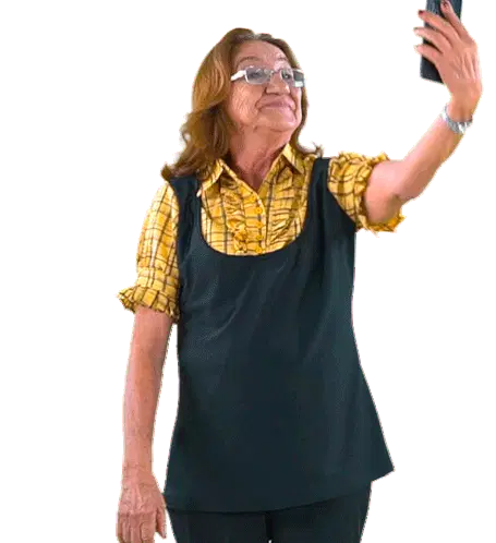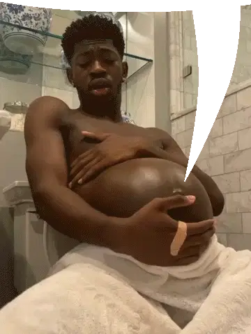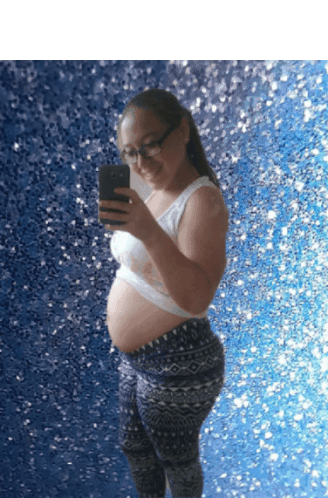 A pregnant woman smiles while taking a selfie, showing her baby bump against a sparkling blue background.