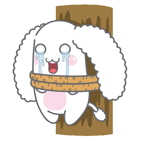 A cartoon sheep with a rope around its mouth, looking distressed and signaling for help with an SOS button.