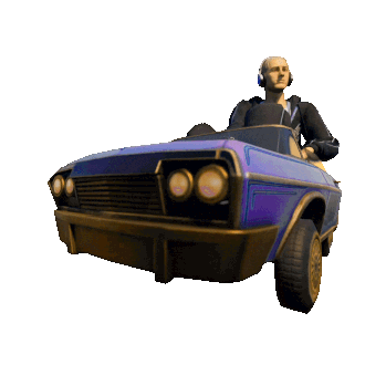 a man wearing headphones is driving a blue car