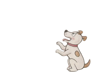 An adorable cartoon dog sits up on its hind legs, wagging its tail with an excited and happy expression.