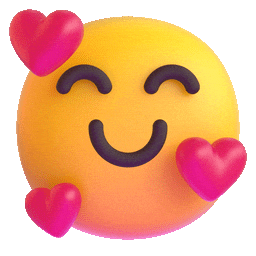 Um emoji 3D amarelo e sorridente com olhos fechados, cercado por corações rosa flutuantes, expressando amor e carinho.