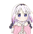 An animated sticker of a cute little girl with purple hair and blue eyes, wearing a pink dress and a pink bow, expressing various emotions.
