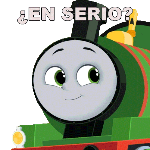Percy from Thomas & Friends reacts with a surprised expression, asking '¿En Serio?' (Seriously?) in this animated sticker.