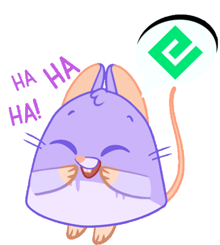 A cute purple mouse laughs heartily, with a speech bubble showing the green Energi NRG cryptocurrency logo.