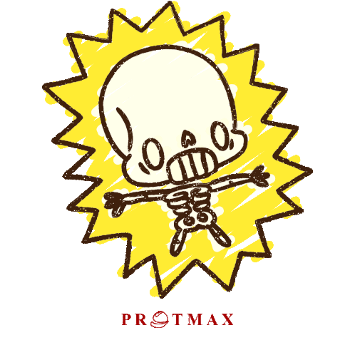 Um esqueleto animado recebendo um choque elétrico, com a palavra Protmax. Perfeito para expressar energia e surpresa.