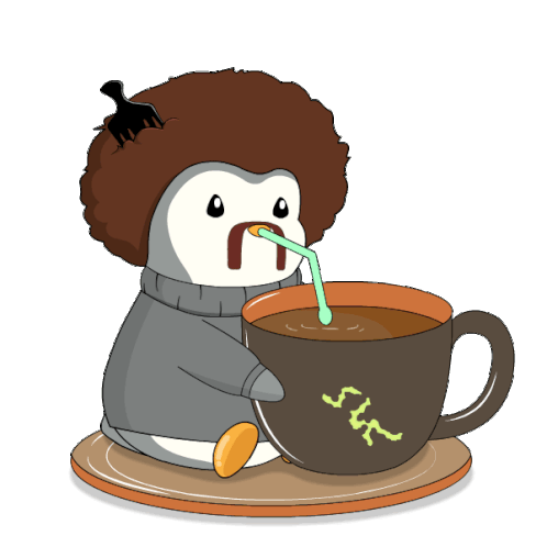 A cute cartoon penguin with an afro sips coffee through a straw, getting a jolt of energy with green zaps.