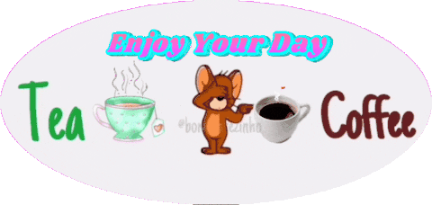 Jerry Mouse stands between steaming cups of tea and coffee, wishing everyone to 'Enjoy Your Day' in a cheerful animated sticker.