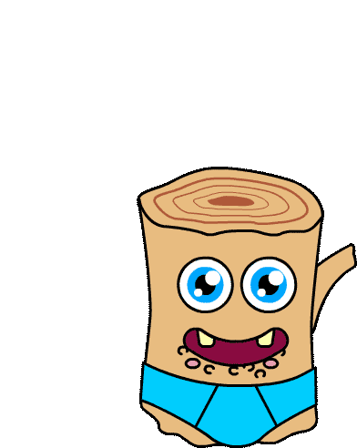An animated, enthusiastic tree stump character with a happy face and blue underwear, wiggling excitedly.