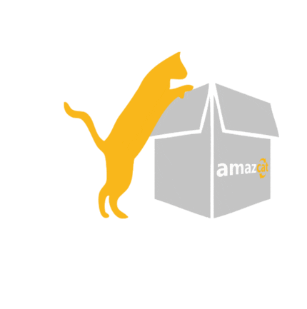 A yellow cat silhouette jumps playfully onto an 'amazcat' branded cardboard box.