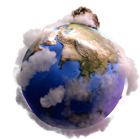 An animated 3D Earth surrounded by clouds, embraced by a human figure, symbolizing care and protection for the environment.