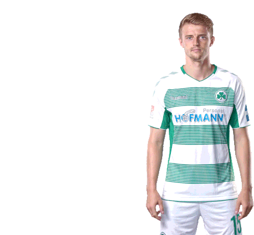 Ernst Sebi Ernst, a football player, celebrates with a cheering gesture, wearing his team's jersey.