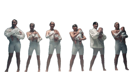 Rigoberta Bandini sticker featuring six women in white outfits, each holding a baby, swaying gently.