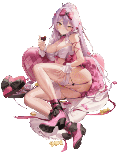 Erysichthon from Destiny Child, dressed in a seductive pink Valentine's outfit, sits on a heart cushion holding candy.