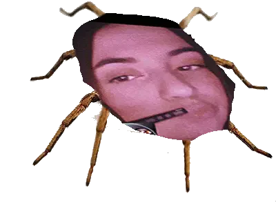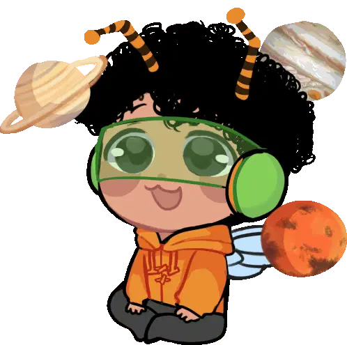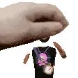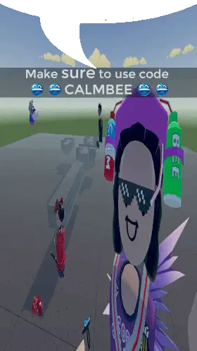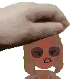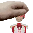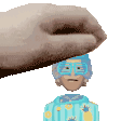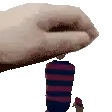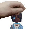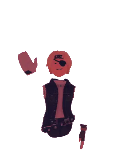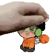 Animated sticker featuring Esak, the Rec Room character, with a mask, held by a hand.