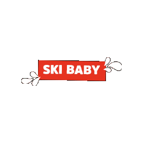 A vibrant red sign featuring the white text 'SKI BABY' with decorative splashes, representing the Escuela Mountain brand.