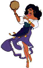 Esmeralda from Disney's The Hunchback of Notre Dame dances joyfully, playing her tambourine with vibrant energy.