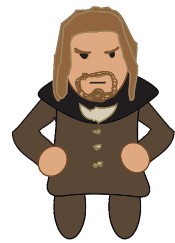 A cartoon man, Michael Omorphosios, from Elder Scrolls, with a beard and brown coat, stands angrily with a pickle between his legs.