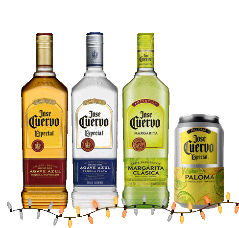 A festive display of Jose Cuervo Especial tequila bottles and a Paloma can, adorned with colorful Christmas lights.