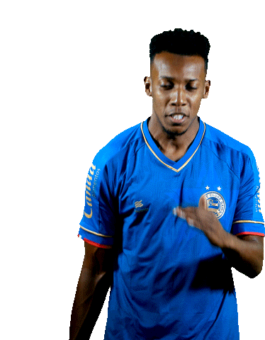 A football player from Esporte Clube Bahia in a blue jersey smiles and clenches his fist, showing team spirit.