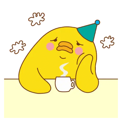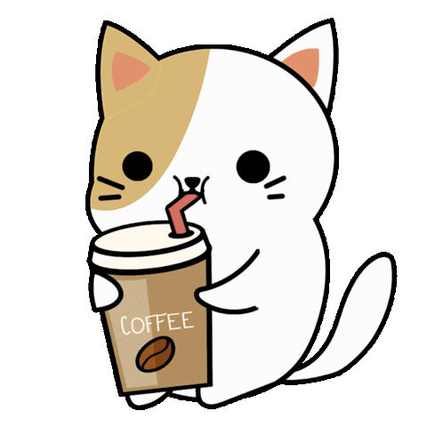 Adorable cartoon cat with a tan patch on its head, happily sipping coffee from a cup labeled 'COFFEE'.