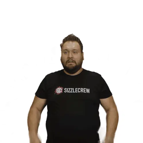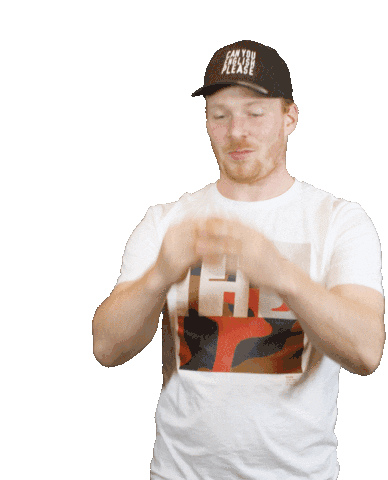 A man in a cap and HB t-shirt makes a satisfied 'mmm' face while miming eating, showing enjoyment of delicious food.